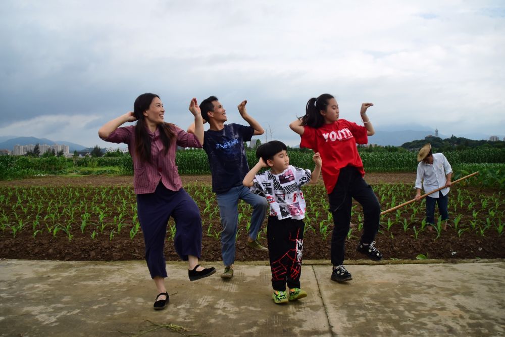 2020年6月1日,浙江省瑞安市马屿镇霞岙村村民彭小英(左一)、范得多(左二)和两个孩子在跳“曳步舞”。多年前,范得多在一次车祸中受伤,患上抑郁症。妻子彭小英开始带着丈夫一起跳舞,范得多的情况逐步好转。夫妇俩经常在网络上直播跳舞,屏幕前漾出的笑容感染着越来越多的人。