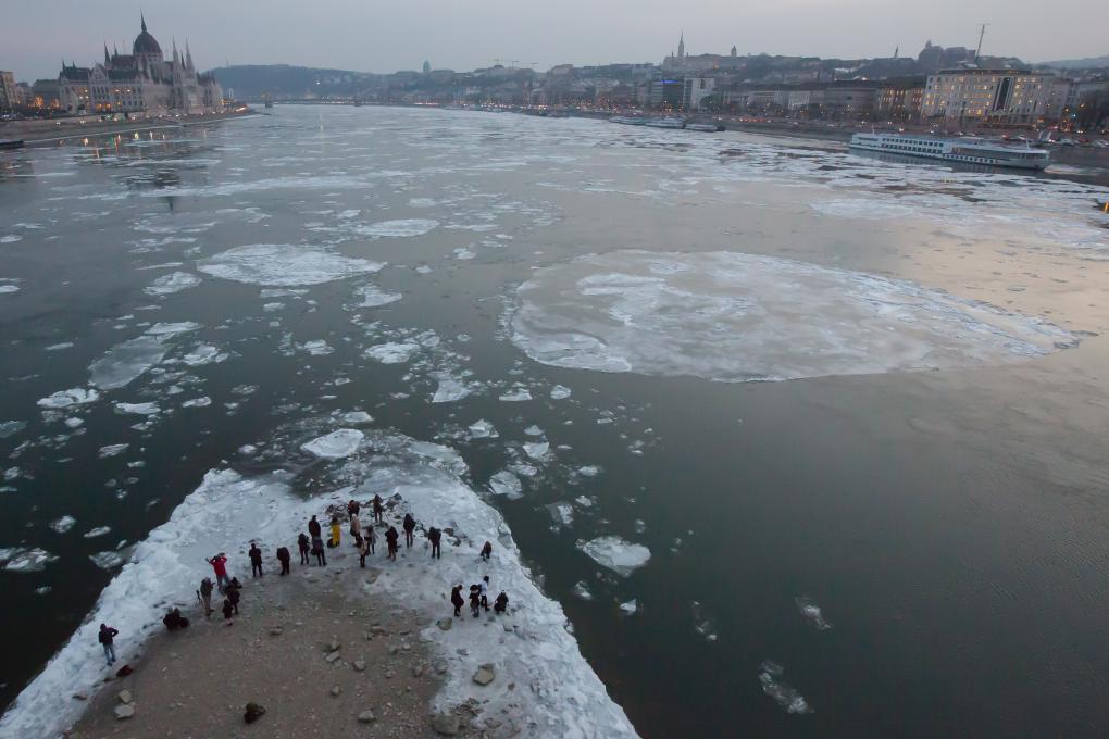 2017年1月9日,在布达佩斯,摄影师在玛尔吉特岛拍摄多瑙河上的浮冰。