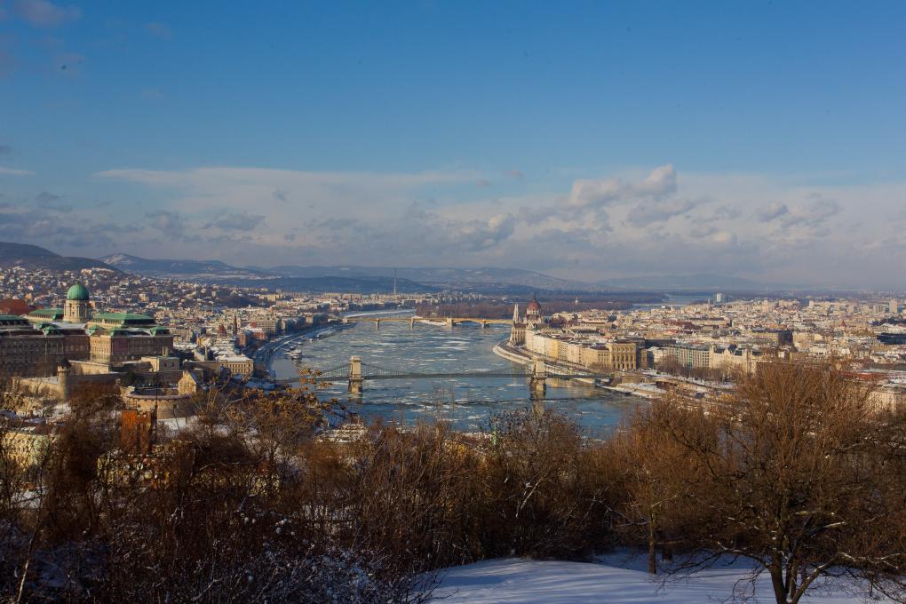 2012年2月15日从布达佩斯多瑙河畔的盖雷特山上拍摄的雪景。
