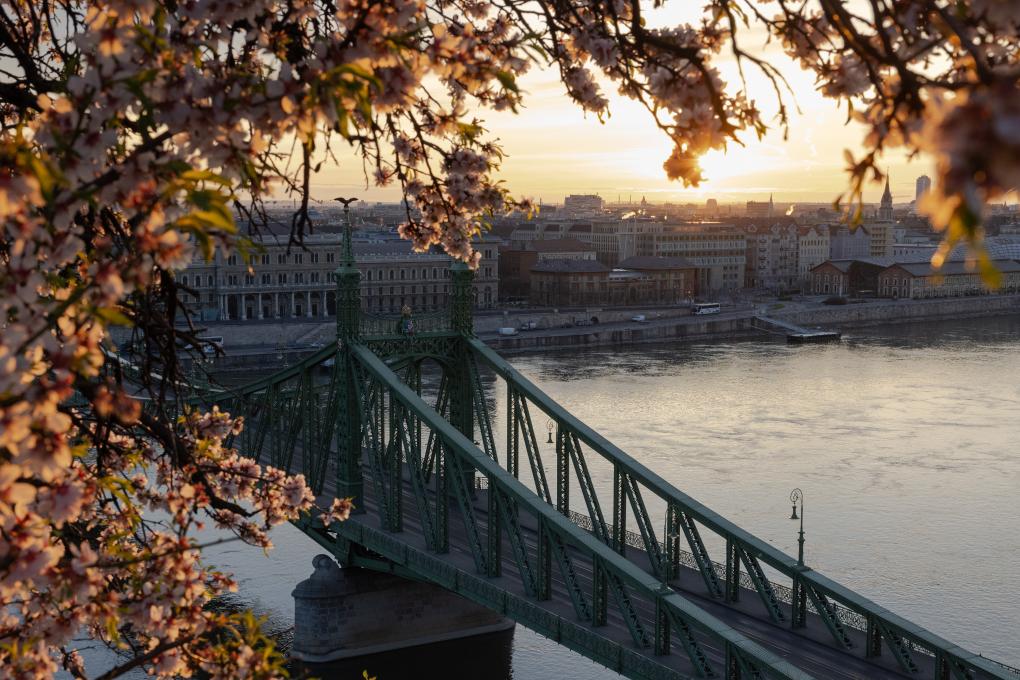 2024年3月17日在布达佩斯拍摄的鲜花掩映的自由桥。