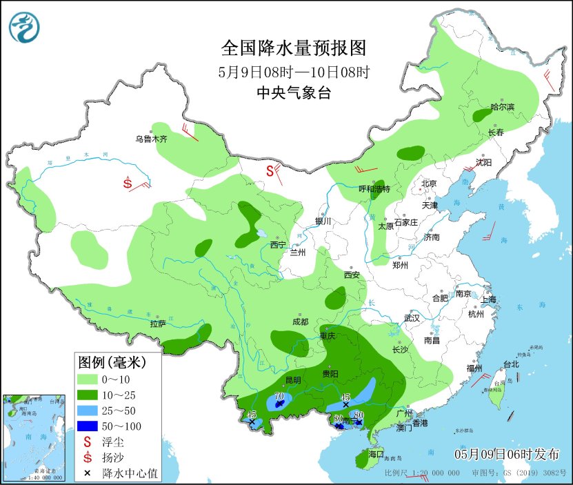 人民网北京5月9日电 (温璐、高清扬)据中央气象台网站消息,昨日,广东、广西、海南及贵州、云南、四川、陕西等地部分地区出现大雨或暴雨,广西南宁、崇左、百色、钦州及广东茂名、云浮等局地大暴雨,南宁市区出现明显城市内涝。预计今天,云南、贵州、广西的降雨还将持续,雨量以中到大雨为主,云南东南部、广西南部局地有暴雨。另外,5月10日至12日,南方地区将有新一轮较强降雨过程,江南、华南北部及贵州等地的部分地区先后有大到暴雨,局地大暴雨。