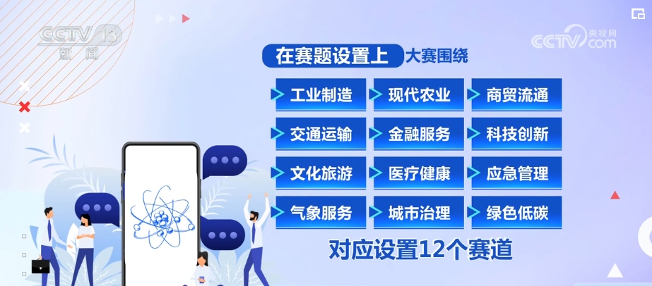 在赛题设置上,大赛围绕工业制造、现代农业、商贸流通、交通运输、金融服务、科技创新、文化旅游、医疗健康、应急管理、气象服务、城市治理、绿色低碳12个行业及领域,对应设置12个赛道。