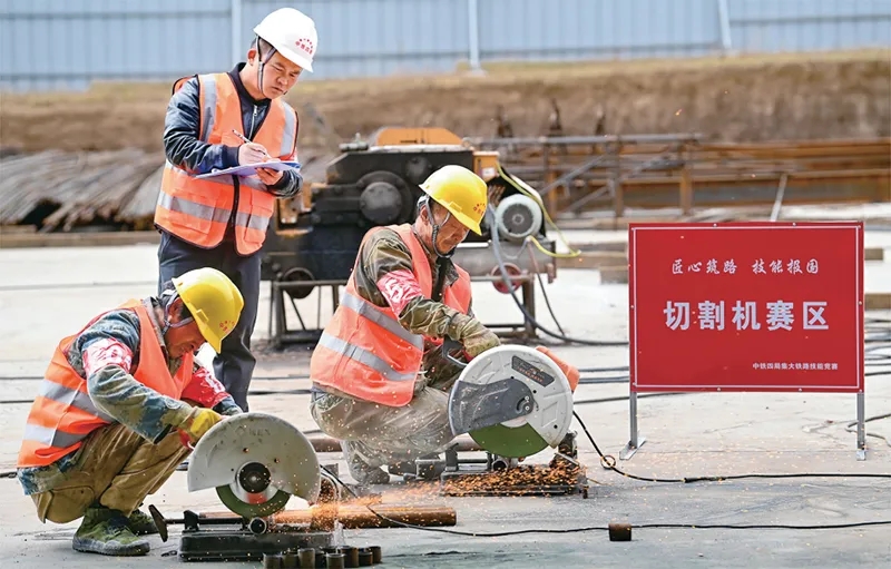 劳动创造了中华民族,造就了中华民族的辉煌历史,也必将创造出中华民族的光明未来。图为2023年4月24日,中铁四局集大原高铁内蒙古丰镇段项目部举行“匠心筑路 技能报国”主题岗位技能比赛,建设者参加切割机操作项目比赛。新华社发 王正/摄