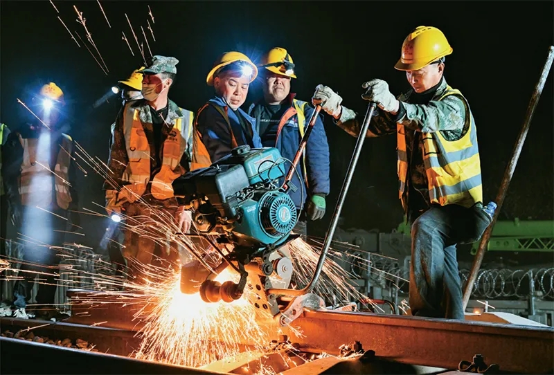 2024年4月10日,在内蒙古包头市,包银高铁引入包头枢纽工程的关键控制性工程之一——包西上行线路拨接完成施工。此次施工完成,标志着包银高铁引入包头枢纽包头站改造工程取得重大进展,为包银高铁开通奠定坚实基础。图为4月10日凌晨,工人在包西上行线路上作业。新华社记者 刘磊/摄