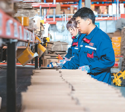 在中国(黑龙江)自由贸易试验区黑河片区,黑河跨境电商园区智能仓储物流中心的工人把打包好的货物通过传送带送到快递分拣场。新华社记者 谢剑飞摄