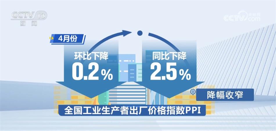 4月份,随着工业生产继续恢复,部分行业需求阶段性回落,全国工业生产者出厂价格指数PPI环比下降0.2%,同比下降2.5%,降幅收窄。