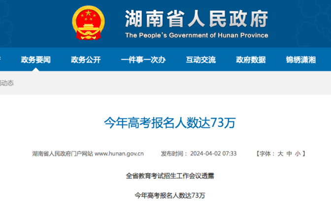 据湖南日报:2024年,湖南高考报名人数共有73万人,比上年增加4.6万人,报名人数创历史新高。