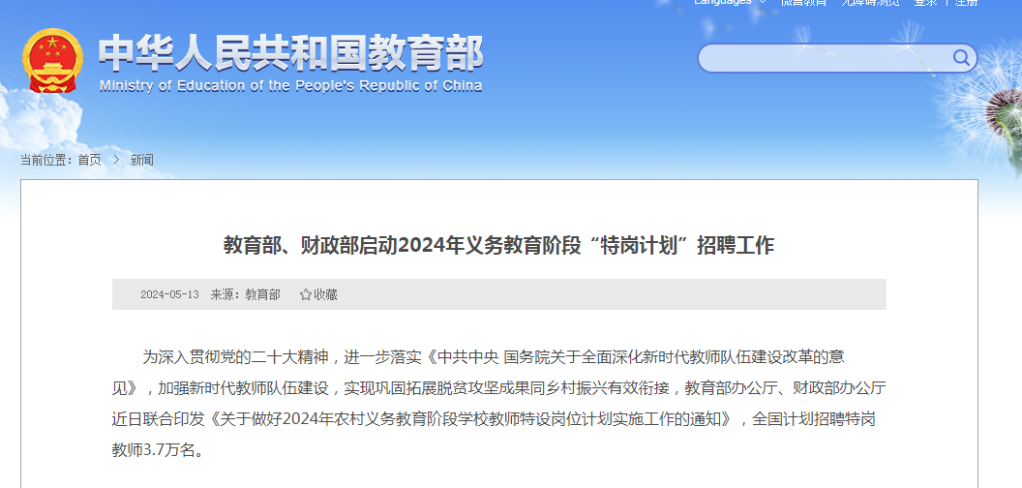 来源标题:教育部、财政部启动2024年义务教育阶段“特岗计划”招聘工作