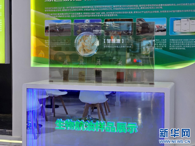 中国航油的展台展示的可持续航空燃料的原料。