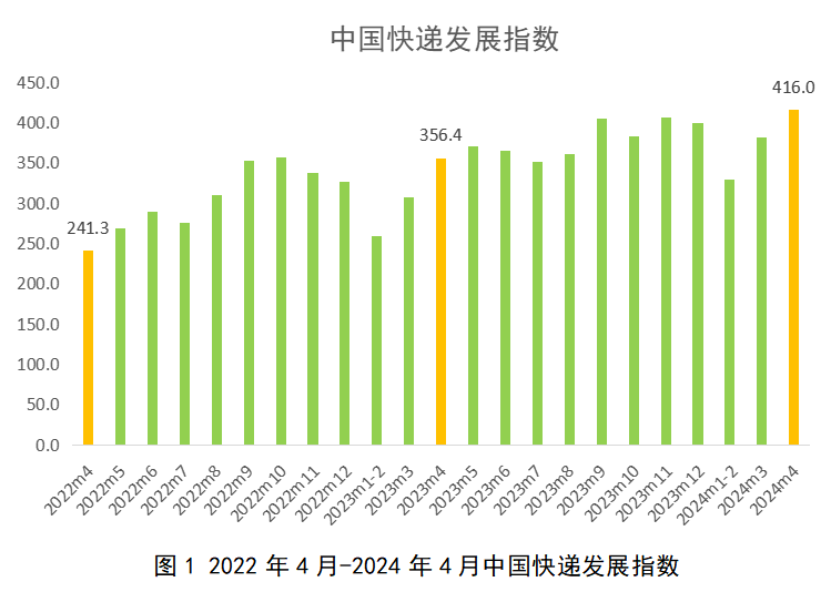 今天,国家邮政局发布2024年4月中国快递发展指数报告。经测算,2024年4月中国快递发展指数为416,同比提升16.7%。其中发展规模指数、服务质量指数和发展能力指数分别为494.2、648.8、221.0,同比分别提升27.7%、15.5%、3.5%,发展趋势指数为67.7。4月,行业市场规模稳步增长,服务质效不断提升,发展能力有所增强,运行态势整体向好。