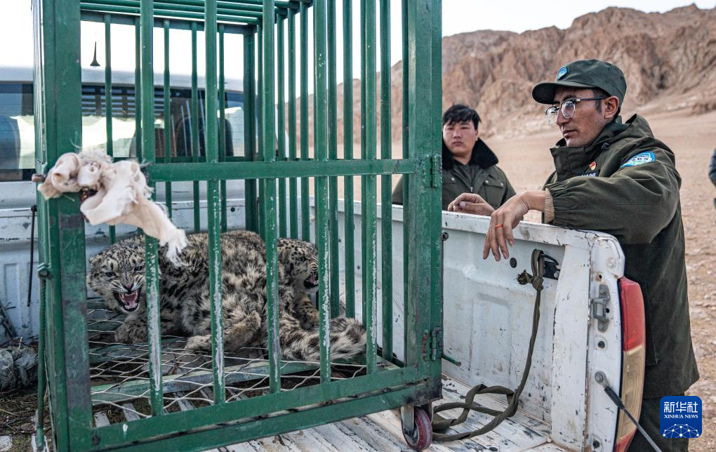 尼玛县野生动物管护队员在运送即将放归自然的雪豹(5月13日摄)。新华社记者 丁增尼达 摄