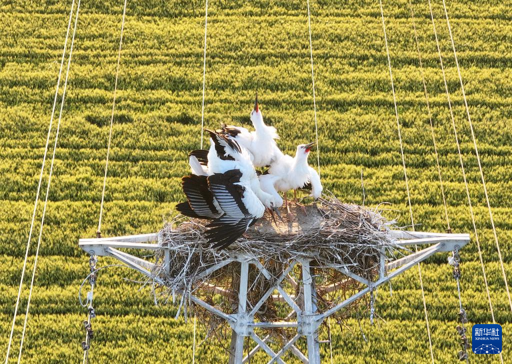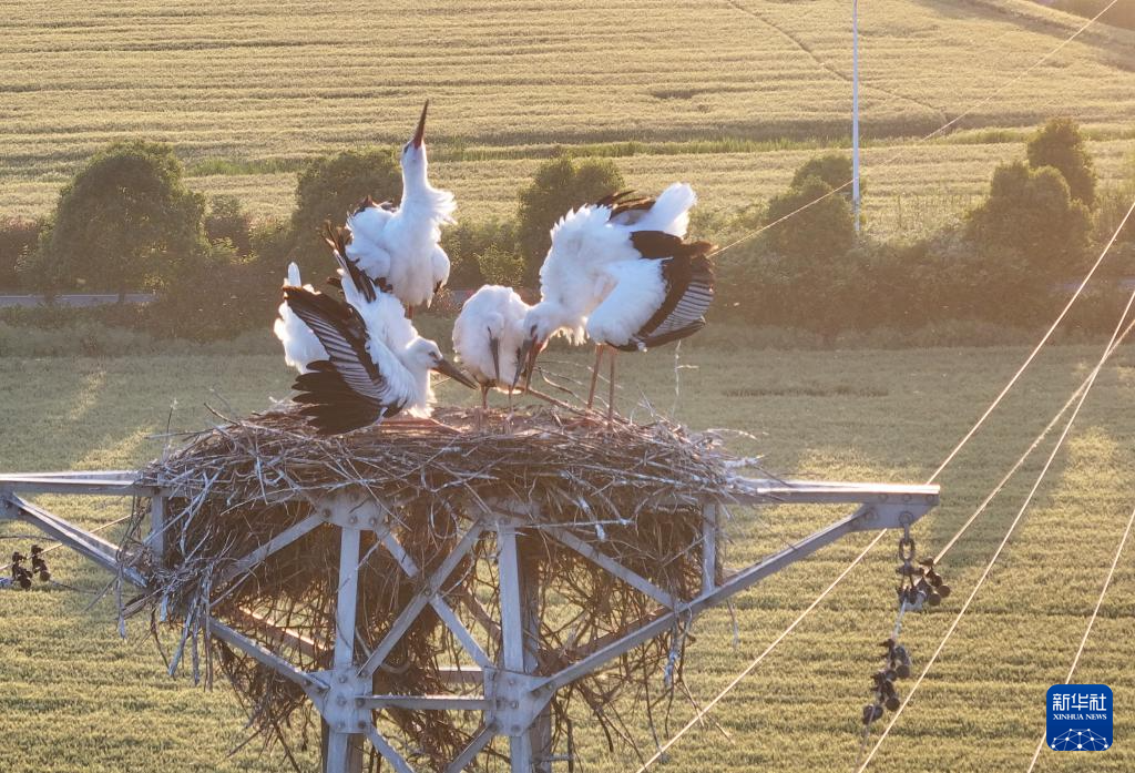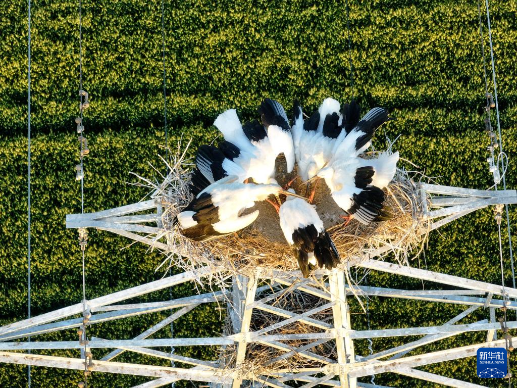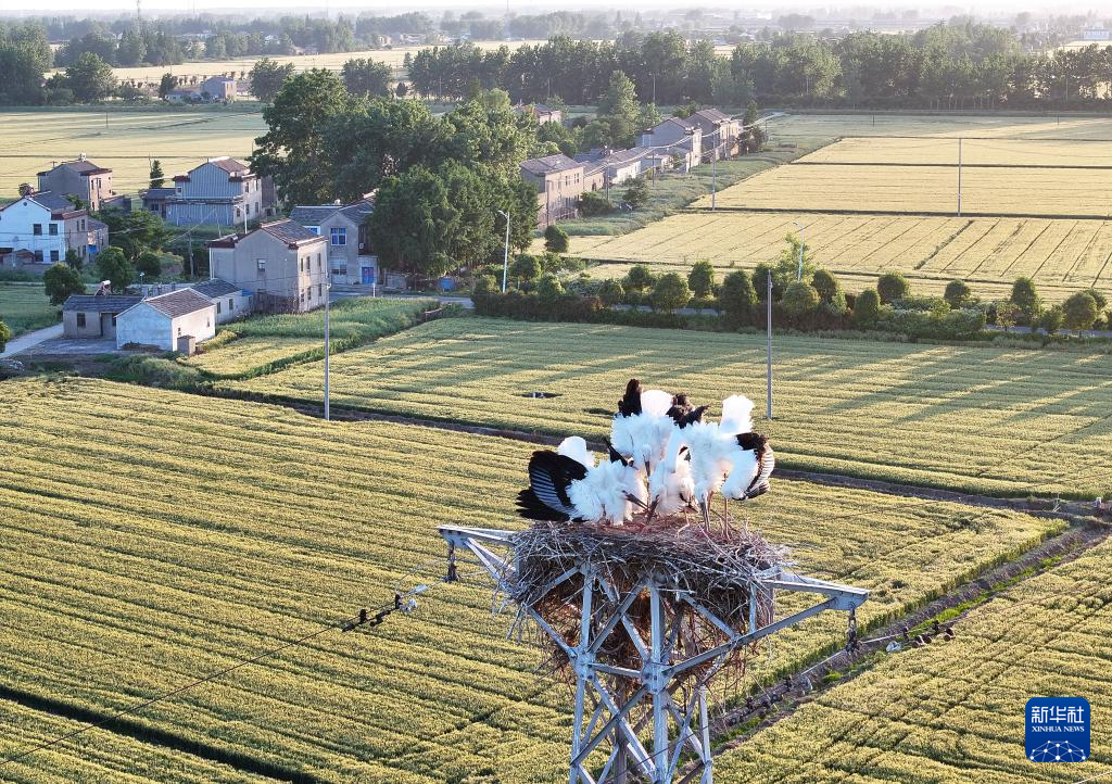 5月16日,东方白鹳栖息在高邮市周山镇江苏之心地理信息园旁的铁塔上(无人机照片)。新华社记者 季春鹏 摄