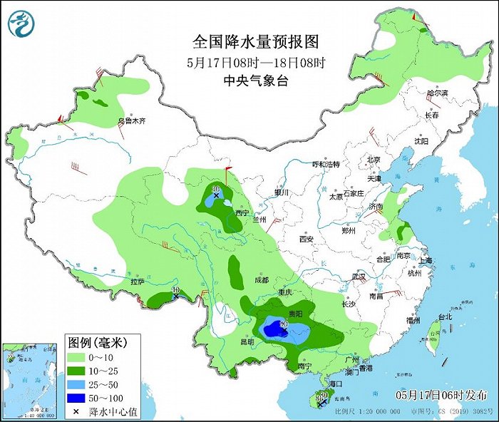 昨日,全国大部地区降水稀少,西藏东部、川西高原、云南东北部和东南部、贵州西南部、海南岛南部等地部分地区出现中到大雨,局地暴雨。预计今天,贵州、云南、广西等地有分散性强降水。贵州大部、广西中西部、云南东北部和南部以及西藏东南部、青海东部等地有中到大雨,贵州西南部、广西西北部等地局地有暴雨。上述部分地区伴有短时强降水(最大小时雨量20~40毫米,局地可超过50毫米),局地有雷暴大风或冰雹等强对流天气。
