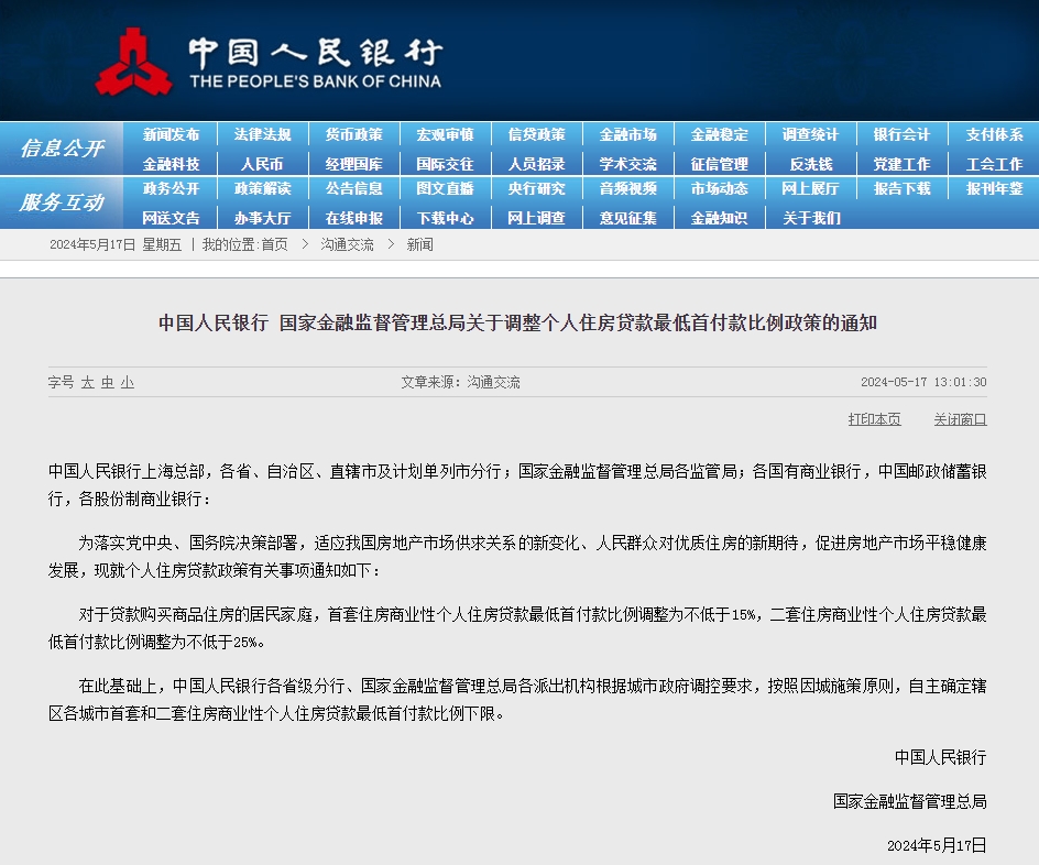 中国人民银行、国家金融监督管理总局5月17日联合发布通知,调整个人住房贷款政策,对于贷款购买商品住房的居民家庭,首套住房商业性个人住房贷款最低首付款比例调整为不低于15%,二套住房商业性个人住房贷款最低首付款比例调整为不低于25%。