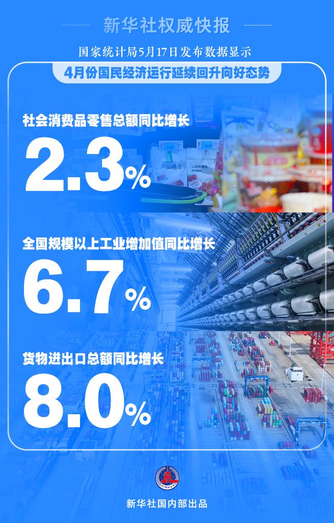 新华社北京5月17日电(记者魏玉坤、韩佳诺)国家统计局17日发布的数据显示,今年4月份,生产需求平稳增长,就业物价总体向好,社会预期持续改善,高质量发展扎实推进,国民经济运行总体稳定,延续回升向好态势。