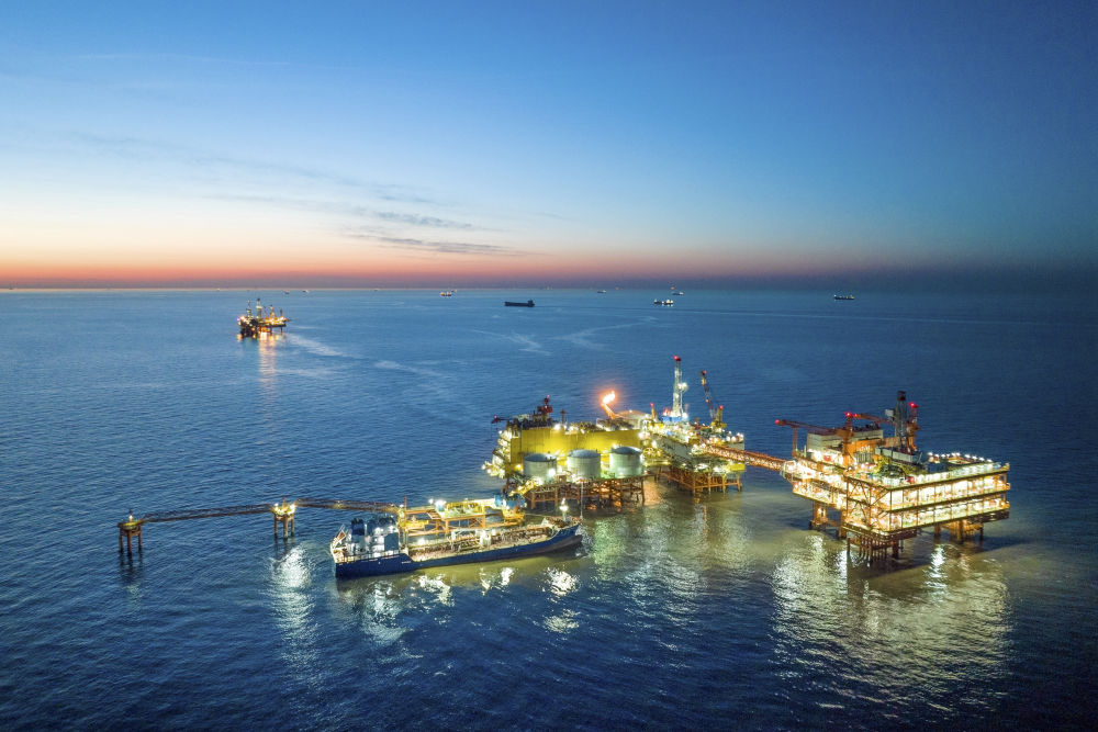 这是2024年1月25日拍摄的埕北油田全景(无人机照片)。当日,位于渤海湾西南部的埕北油田油气处理与岸电设备共建平台——CEPC(中心平台)正式投产,该平台可使油田接入来自陆地的绿色电力,减少海上“自发电”带来的天然气和原油消耗。新华社发(杜鹏辉摄)
