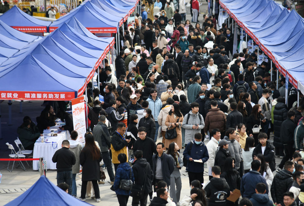 求职者在2024年陕西工会“春送岗位”就业服务月现场招聘会上了解招聘信息(2024年3月6日摄)。新华社记者 张博文 摄