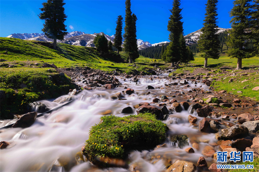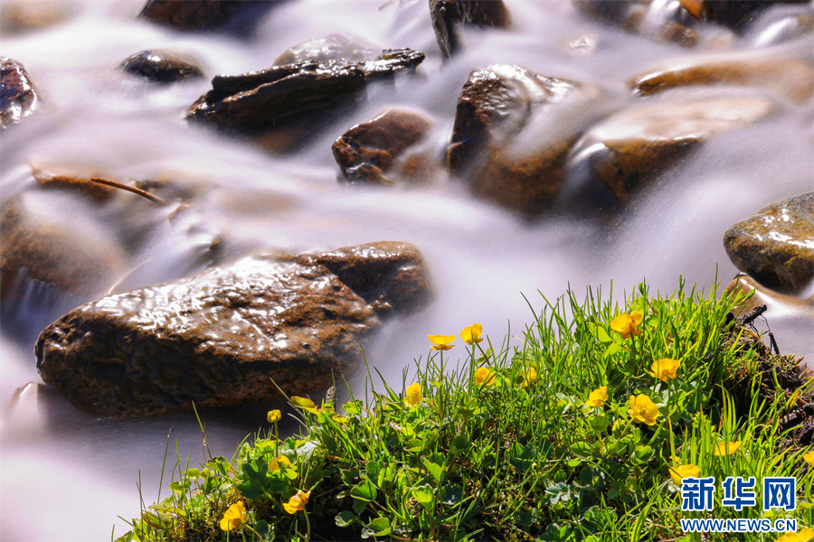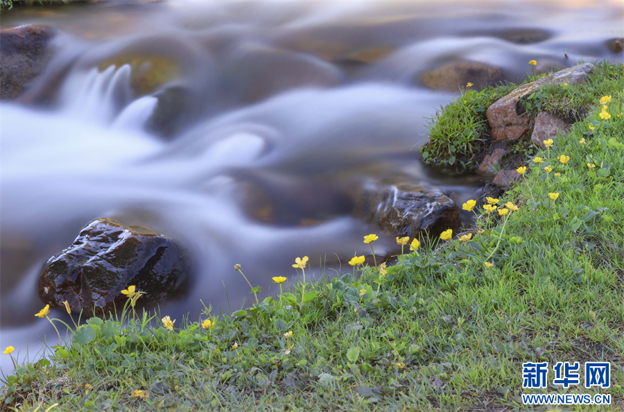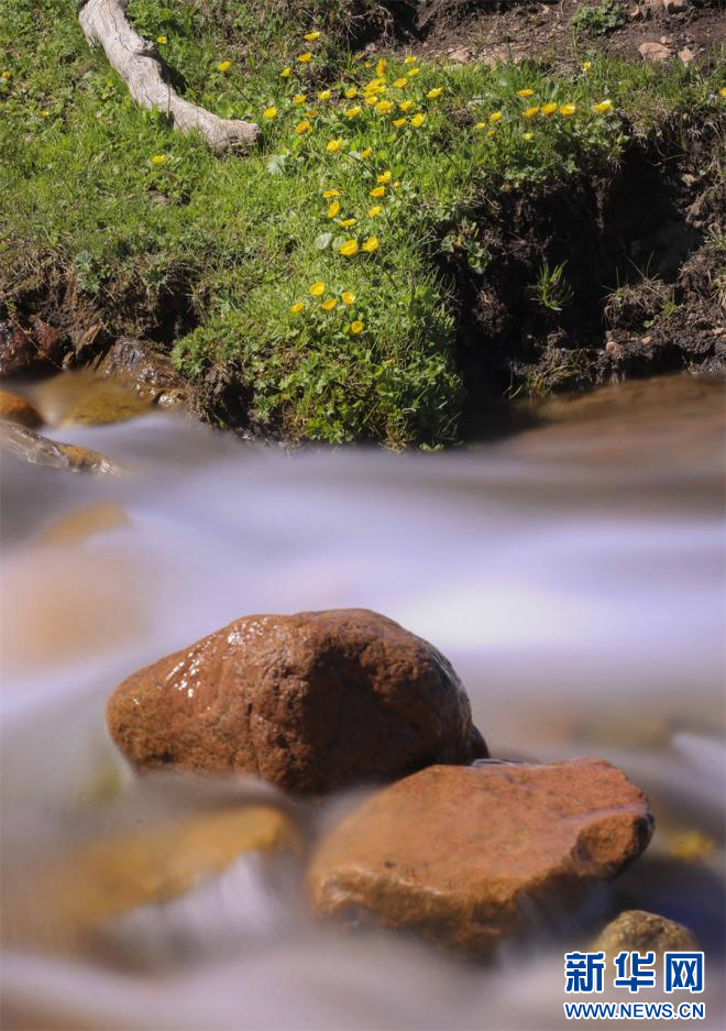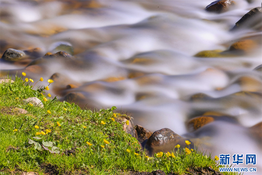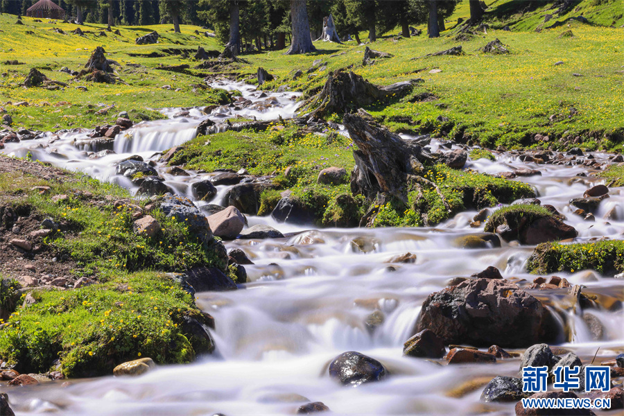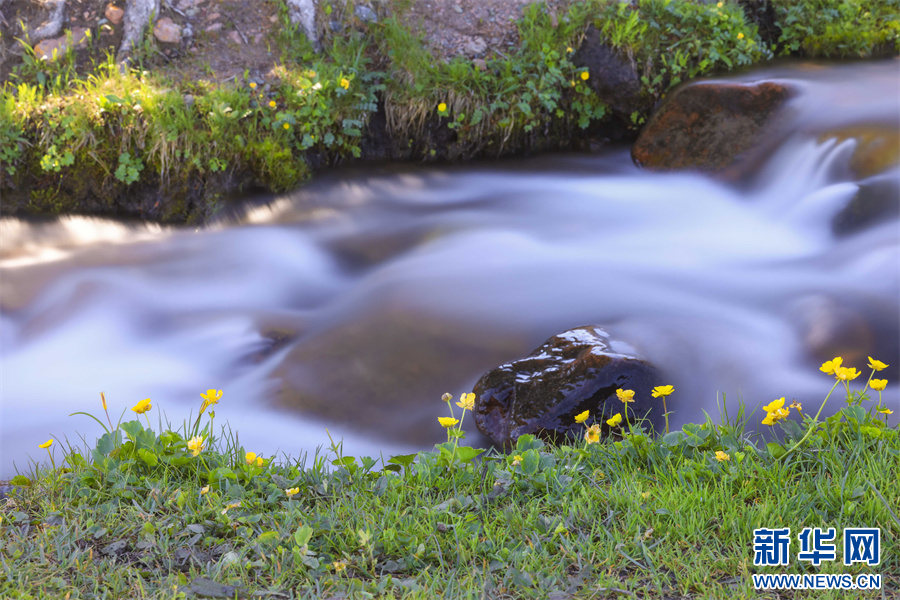 初夏,新疆新源县那拉提空中草原,绿草茵茵,黄色、白色、紫色等各色小花点缀其中,美不胜收。在空中草原,有一股由天山雪水融化形成的清澈小溪,沿着草原和松林中穿行而下。在溪水的滋润下,小溪旁的野花茁壮生长,在相机慢门的拍摄下,流动的溪水或如云雾般缥缈,或如丝绸般顺滑,与岸边花朵相映成趣,这些景象或宁静唯美,让人如痴如醉,或震撼人心,富有冲击力,犹如仙境,意境绵长,妙不可言,美得让人留连忘返。
