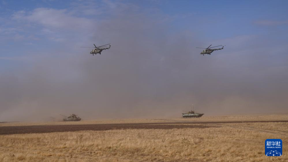 2021年9月23日,在俄罗斯奥伦堡州东古兹靶场举行的“和平使命-2021”上海合作组织联合反恐军事演习实兵实弹演习中,多国联合部队进行陆空协同作战。新华社记者 梅世雄 摄