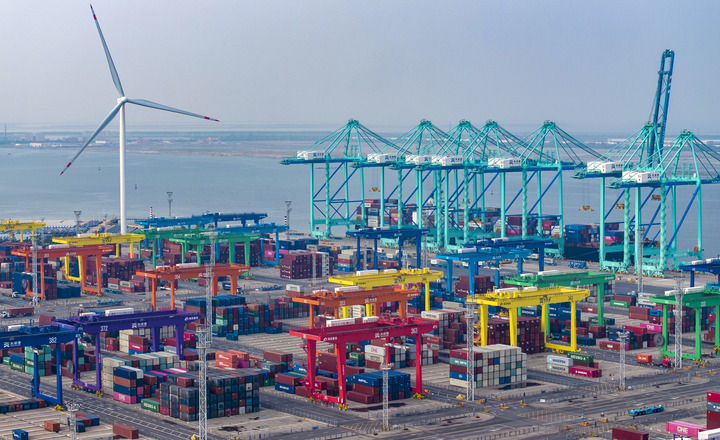 2024年7月3日,一艘集装箱货轮停靠在天津港“智慧零碳”码头(无人机照片)。新华社记者 赵子硕 摄