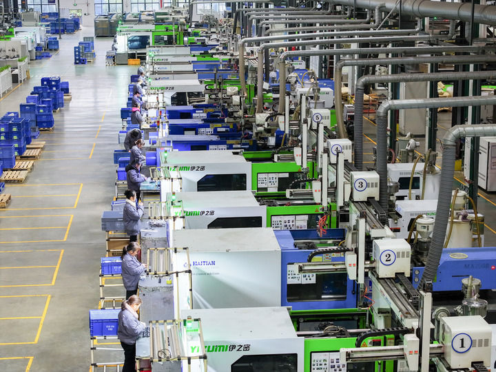 在浏阳高新区的长沙市银宝山新汽车零部件有限公司,工人在汽车零部件生产线上作业(2024年2月1日摄,无人机照片)。新华社记者 陈泽国 摄