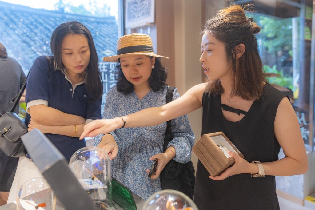 7月28日,在龙门浩老街·下浩里,青年创业者曾进(右一)在她主理的方舟遗留物·标本工作室内为游客讲解标本知识。新华社记者 黄伟 摄