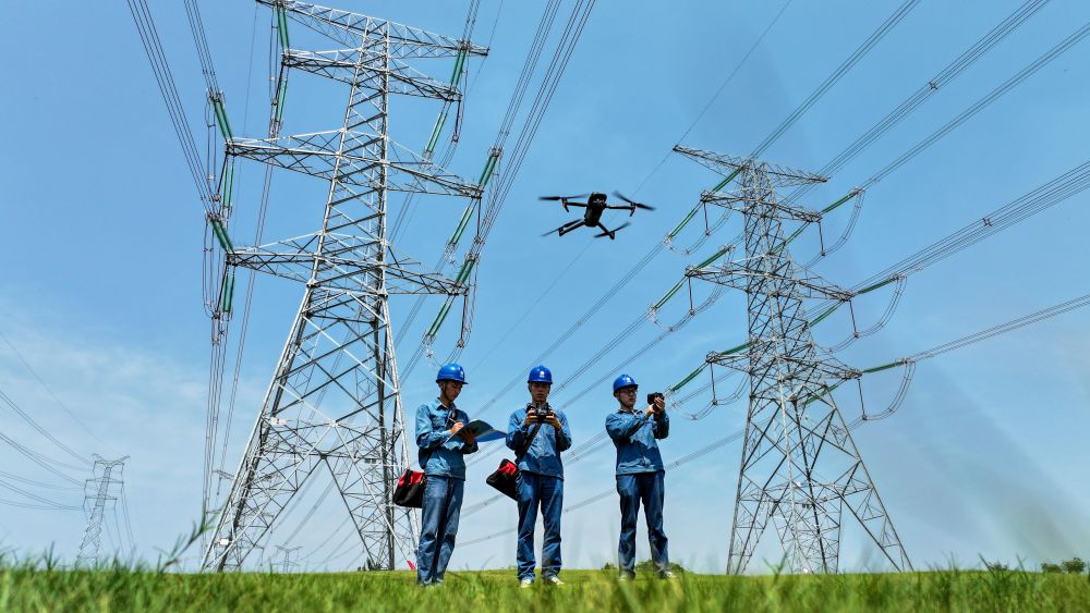 面对安徽、江苏持续高温,皖苏两省的电力工人联合对省际联络线及相关配电设施进行检修,并开展输变电设施巡视检查。这是在安徽省滁州市南谯区,电力工人运用无人机对500千伏输电线路进行巡视检查(2024年8月9日摄)。新华社记者 曹力 摄