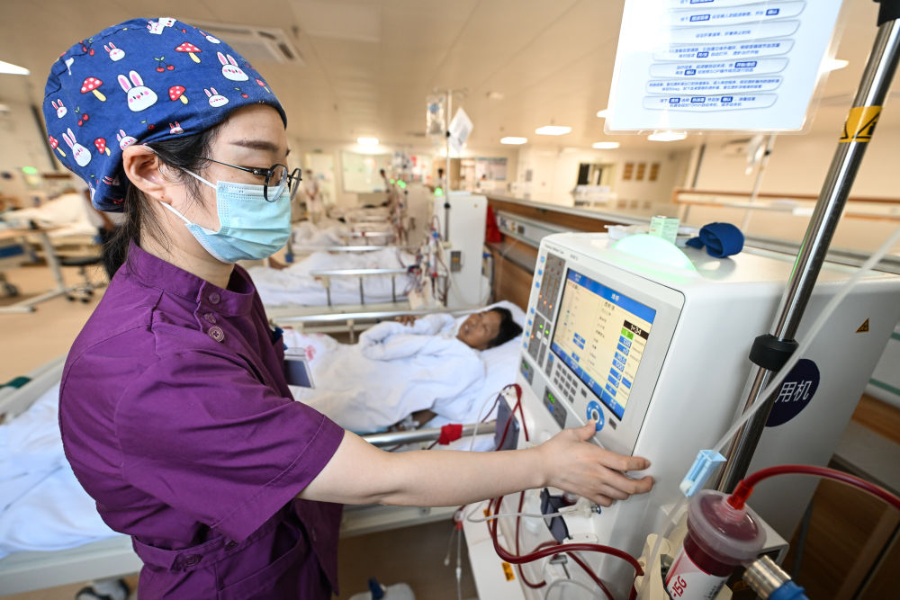 江苏海安市曲塘中心卫生院护士在血液透析中心操作设备(2024年7月31日摄)。海安加快优质医疗资源下沉,对基层医疗机构管理、技术等方面进行帮扶。数据显示,2023年海安市县域内就诊率为90.54%,基层医疗卫生机构门急诊占比为74.86%。新华社记者 季春鹏 摄