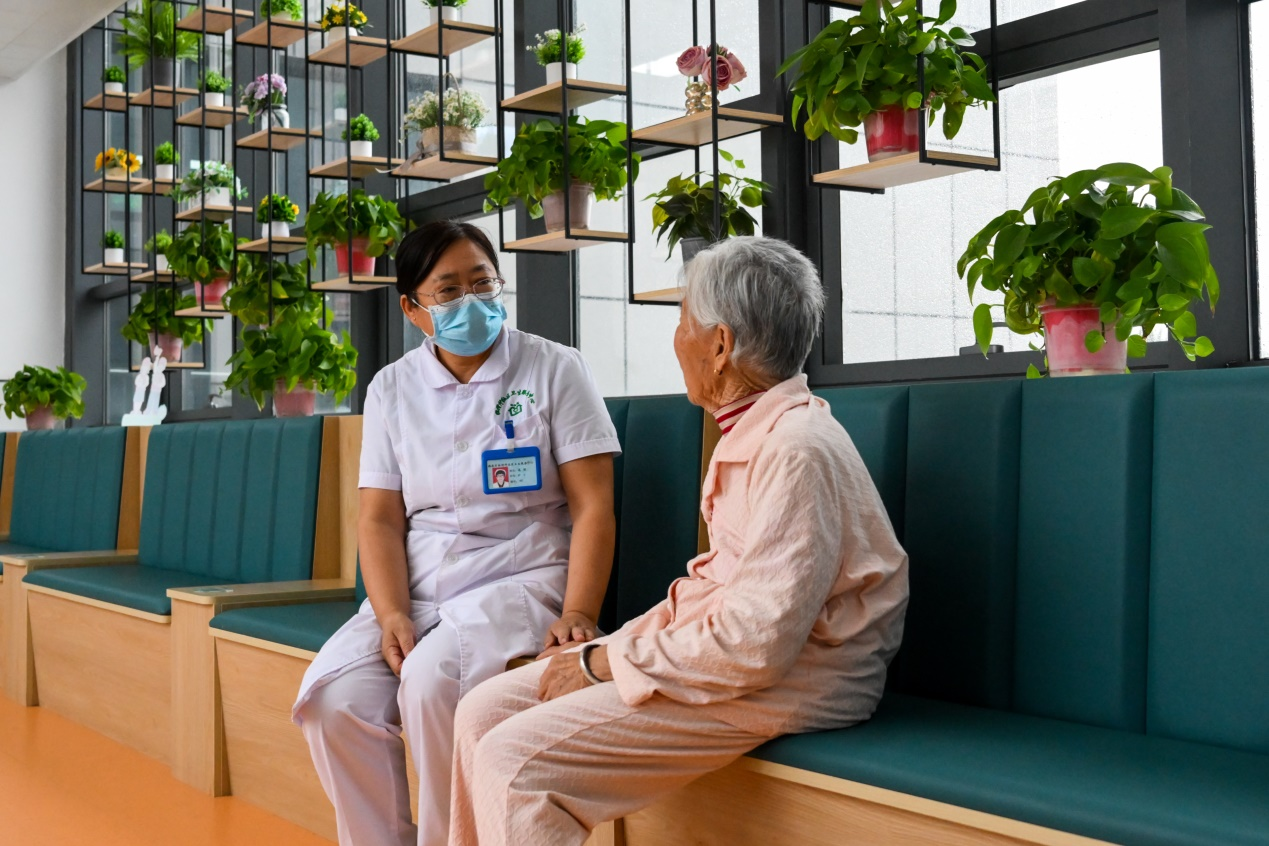 9月4日,医务人员(左)在内蒙古自治区乌海市海南区养老综合服务中心了解老年人的健康情况。 新华社记者 李志鹏 摄