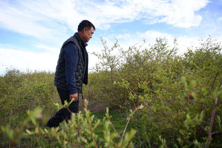 牧民卓玛加布在黄河玛曲段干流沿岸一处草原沙化治理点查看他参与种植的灌木生长情况(2023年7月5日摄)。新华社记者 陈斌 摄