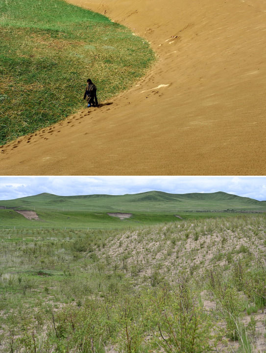 拼版照片:上图为2011年6月9日,甘肃省甘南藏族自治州玛曲县欧拉乡欧强村村民豆格甲走在被沙丘侵入的草场边缘(新华社记者聂建江摄);下图为2023年7月6日拍摄的甘南藏族自治州玛曲县欧拉镇欧强村一处完成沙化治理的草场(新华社记者陈斌摄)。新华社发