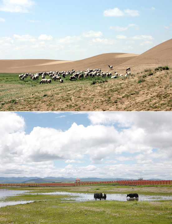 拼版照片:上图为2004年7月19日,羊群在甘肃省甘南藏族自治州玛曲县一处沙化退化的草场上吃草,背后是大片流动沙丘(新华社记者宋常青摄);下图为2023年7月5日,牦牛在甘南藏族自治州玛曲县湿地草原上吃草(无人机照片,新华社记者陈斌摄)。新华社发