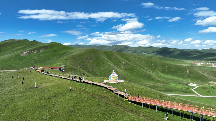 游客在甘肃省甘南藏族自治州玛曲县阿万仓湿地游览(2023年7月6日摄,无人机照片)。新华社记者 陈斌 摄