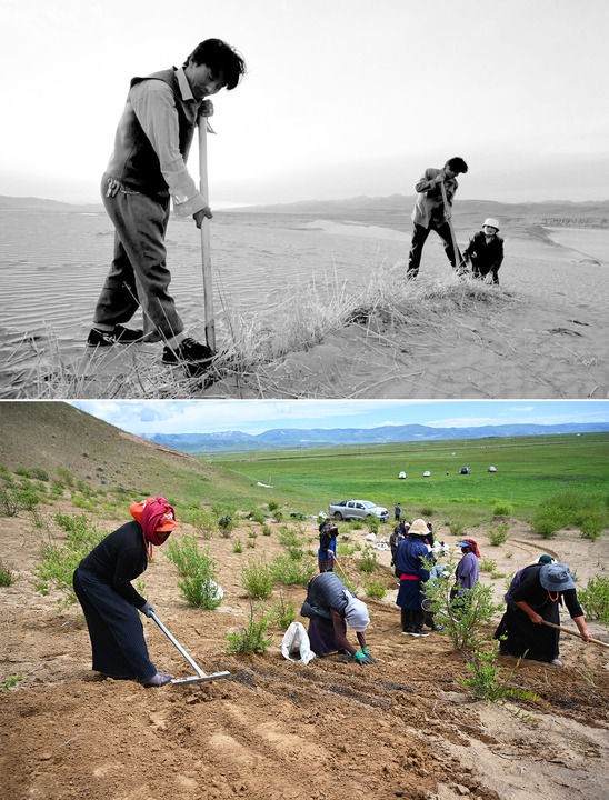 拼版照片:上图为2002年参与防治沙漠化的工作人员在甘肃省甘南藏族自治州玛曲县黄河沿岸一处沙化草场上压沙(新华社记者韩传号摄);下图为2023年7月6日,牧民在甘南藏族自治州玛曲县黄河沿岸一处沙化草原治理点进行草籽补种工作(新华社记者张可任摄)。新华社发