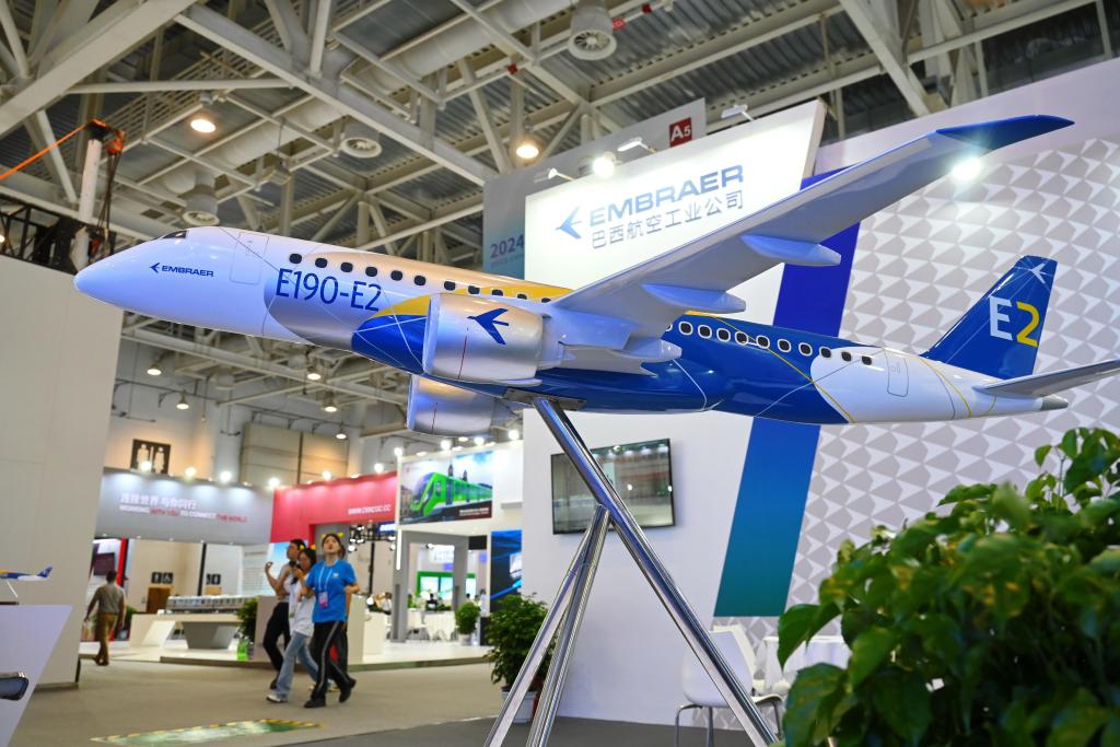 这是在厦门举行的2024金砖国家新工业革命展巴西展位展出的E190-E2飞机模型(2024年9月10日摄)。新华社记者林善传摄