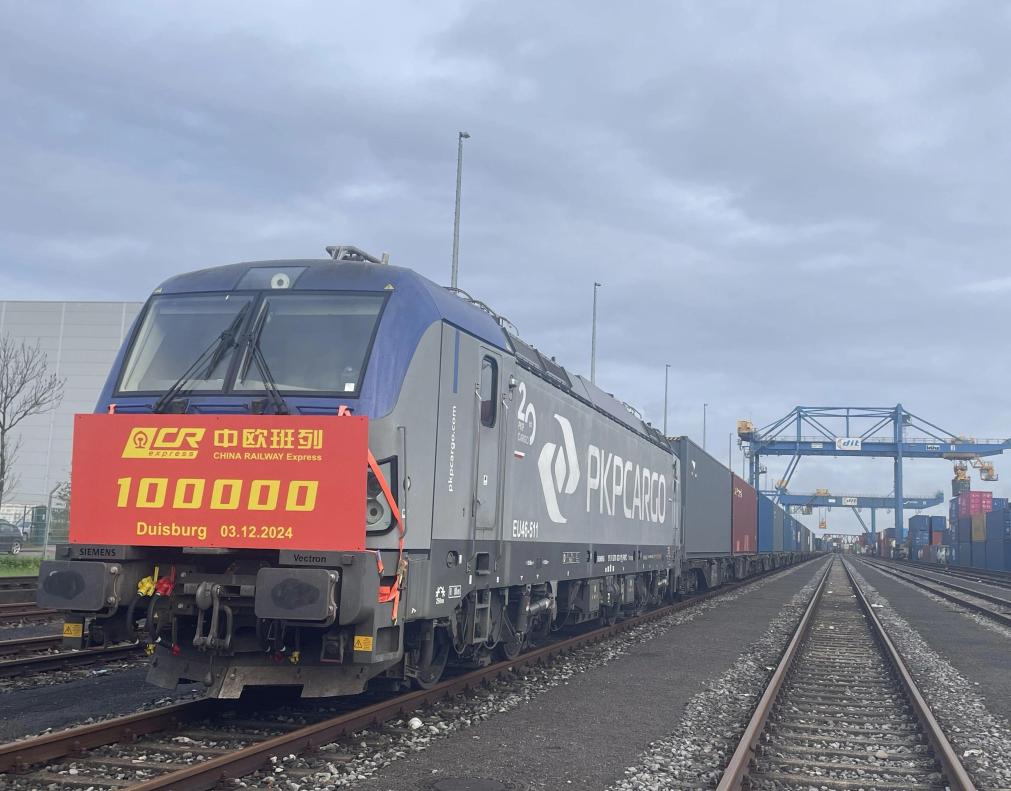 这是2024年12月3日在德国杜伊斯堡市DIT场站拍摄的第10万列中欧班列。新华社发(朱璇摄)
