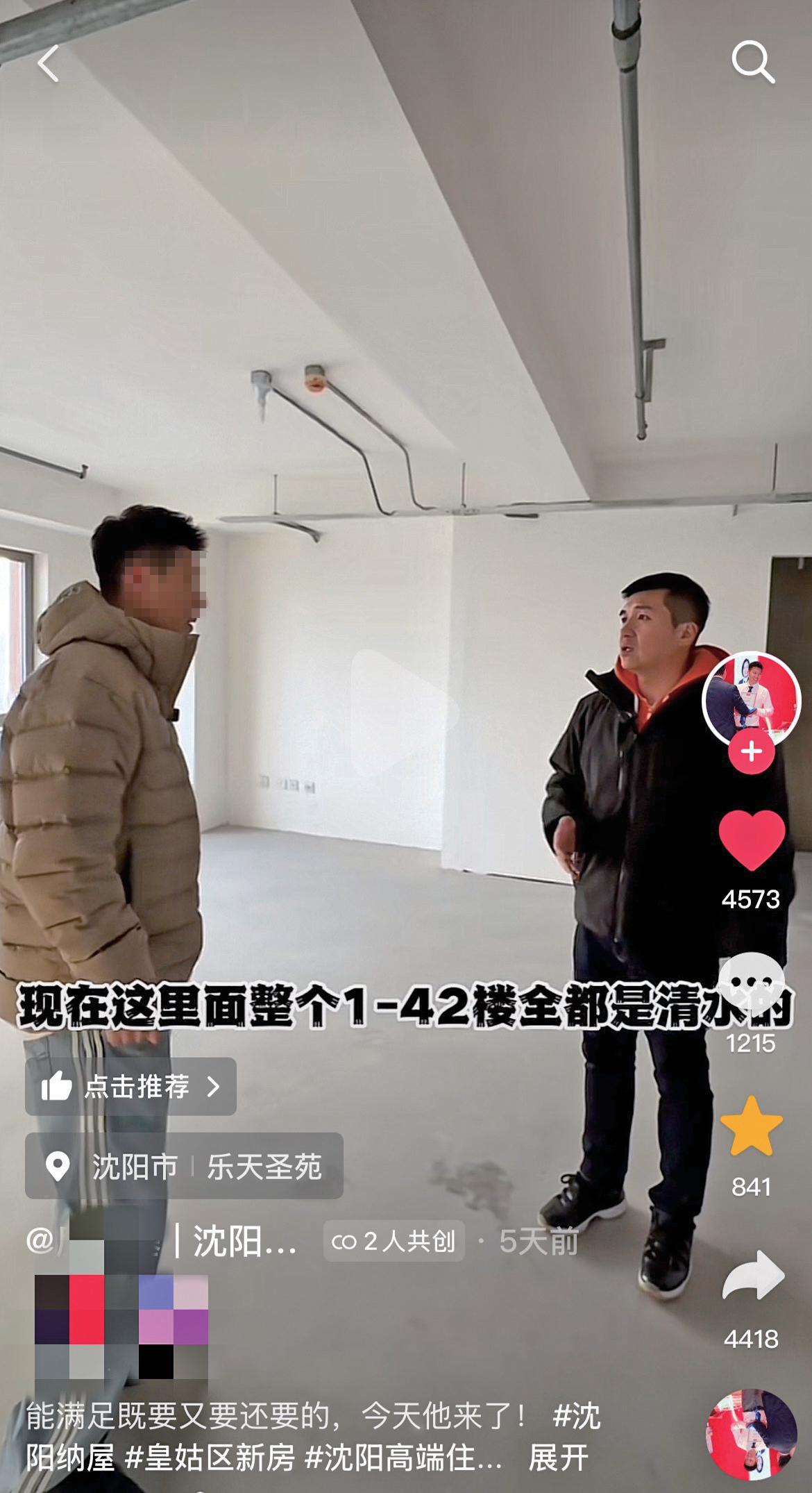 在卖房视频中,闫曦(右)向自媒体房产博主介绍房屋户型。社交媒体截图