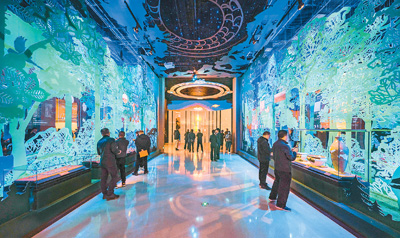 参观者在展厅中欣赏文物。