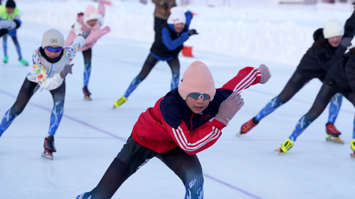 1月9日,在新疆阿勒泰市体育公园,阿勒泰市业余体校的小队员们正在练习滑行技巧。新华社记者 张啸诚 摄