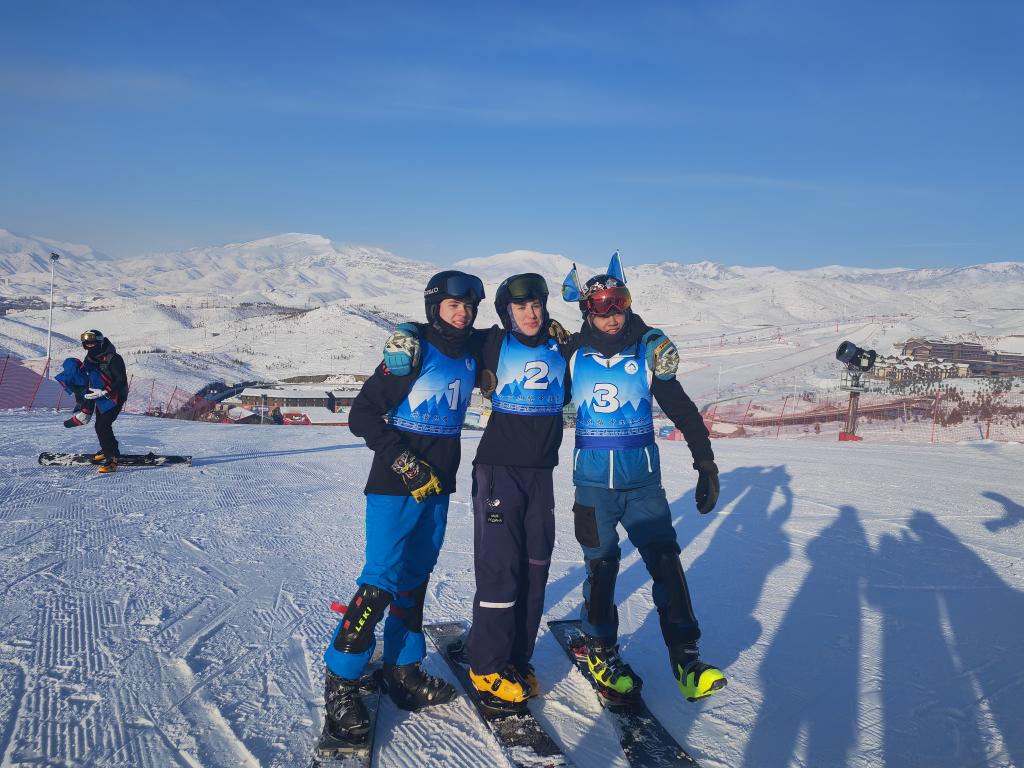 在单板滑雪比赛后,俄罗斯和哈萨克斯坦运动员合影留念。 新华社记者 孙哲 摄