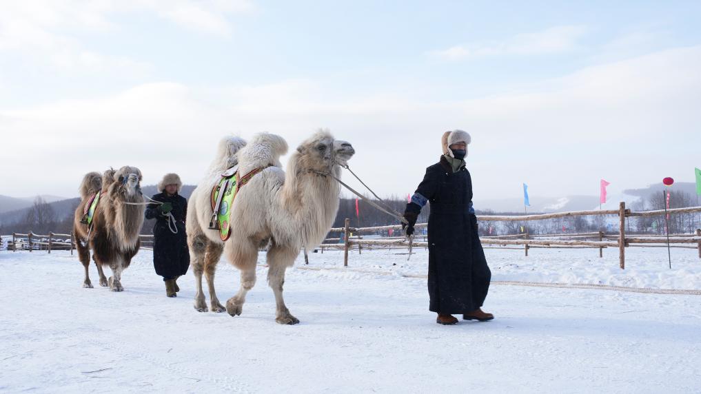 牧民牵着骆驼进入阿尔山市迎新年冰雪那达慕现场。新华社记者 恩浩 摄