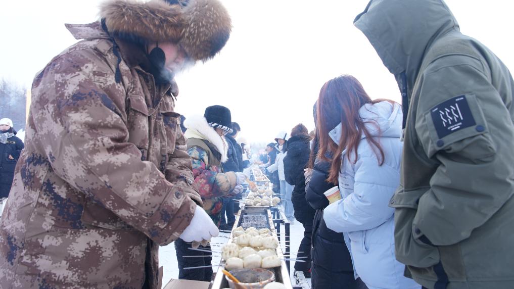 游客在阿尔山市迎新年冰雪那达慕现场排队品尝美食。 新华社记者 恩浩 摄