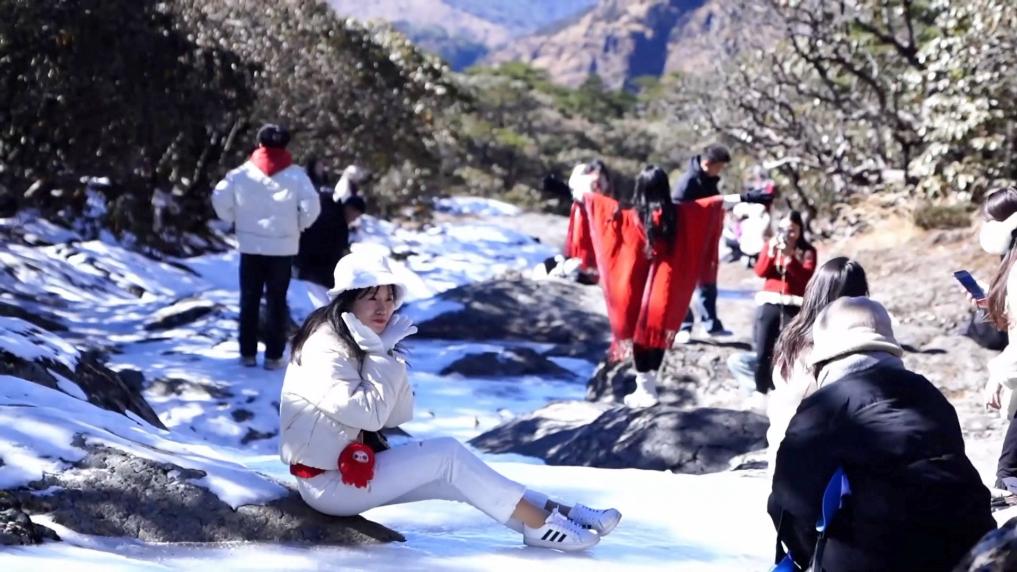 位于春城昆明北部的轿子雪山,是中国纬度最低的冬季积雪山峰之一。隆冬时节,这座雪山再度披上银装。鲜见雪景的东南亚游客兴奋地到此体验高山冰雪游,蓝天、冰湖、冰瀑、雾凇成为他们镜头下的“宠儿”。