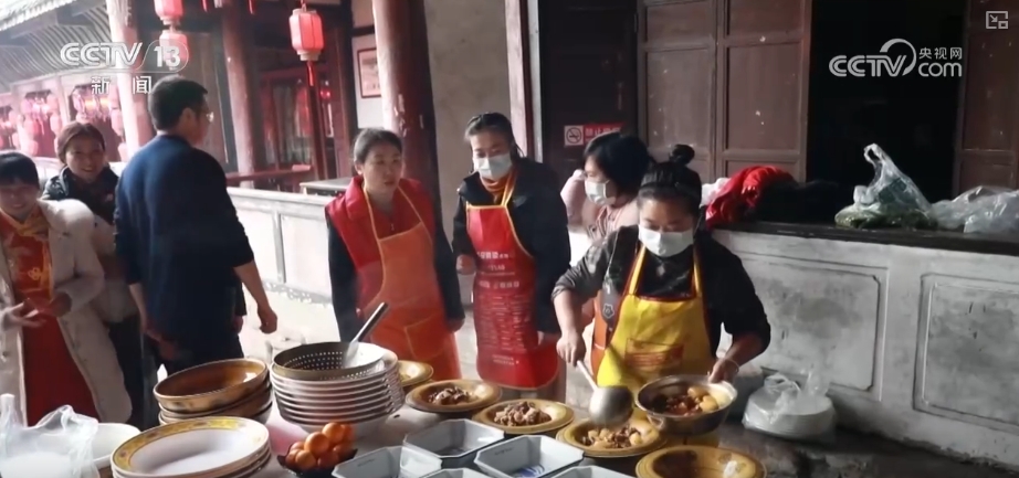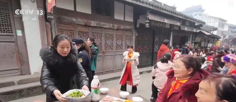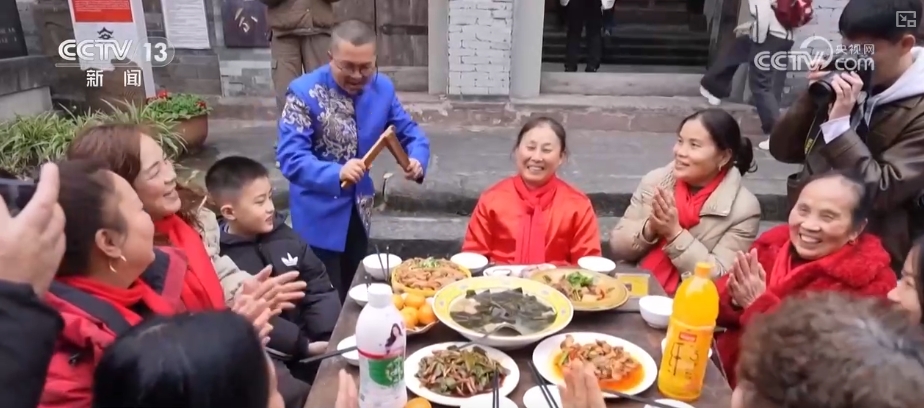 居民们围在一起,举杯共饮、互道祝福,品味当下幸福生活。除了美食,古城里还表演起川剧变脸、说书,让居民和游客在欢乐中喜迎新春的到来。