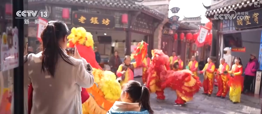除了传统戏曲,在三河古镇的街巷里,各种民俗表演也精彩上演。伴随着铿锵的锣鼓声,上下翻飞的舞龙气势壮观,辗转腾挪的舞狮身姿矫健,还有喜庆热闹的当地传统民俗“闹花船”,丰富多彩的民俗表演充满了浓浓年味。