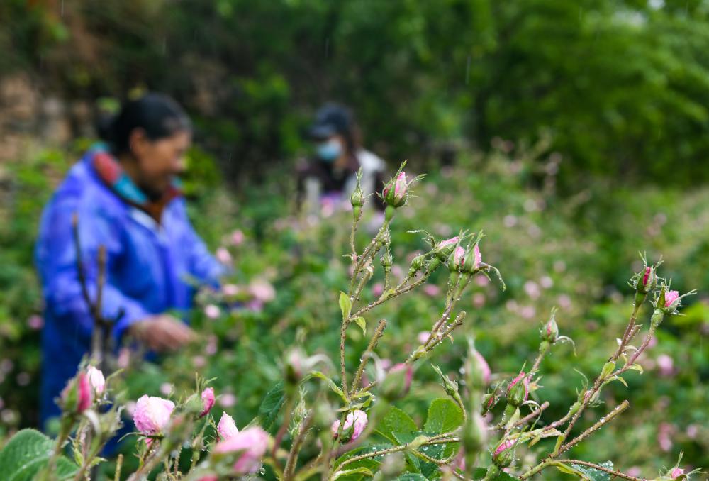 在四川省阿坝藏族羌族自治州小金县新桥乡共和村,当地种植户在采摘玫瑰鲜花(2023年6月14日摄)。新华社记者 王曦 摄