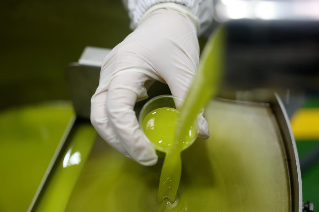 在甘肃省陇南市武都区一家油橄榄加工企业,工作人员查看初榨橄榄油品质(2024年10月31日摄)。新华社记者 陈斌 摄