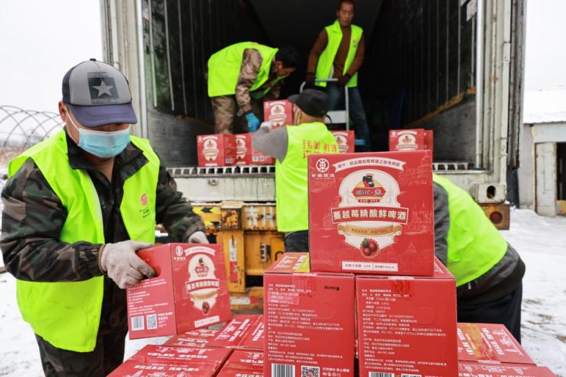 在黑龙江省抚远市蔓越莓啤酒的制造企业,工作人员将蔓越莓啤酒装车(2024年11月4日摄)。新华社发(李拥军摄)