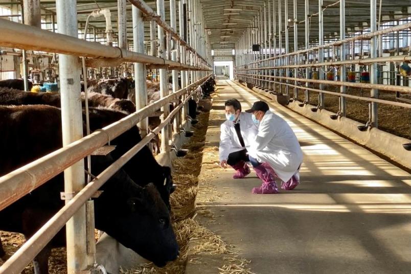 在黑龙江省齐齐哈尔市龙江县的和牛现代化繁殖基地,工作人员查看和牛生长状况(2020年12月3日摄)。新华社记者 刘赫垚 摄