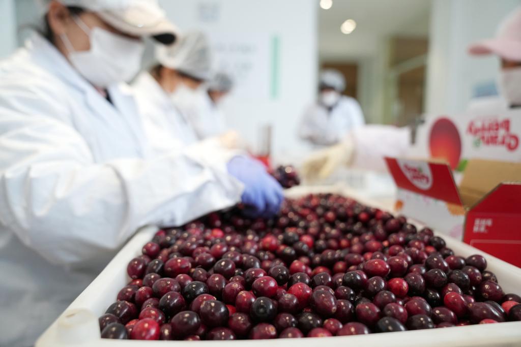 在黑龙江省抚远市蔓越莓种植基地,工作人员分拣蔓越莓鲜果(2024年1月29日摄)。新华社记者 王建威 摄